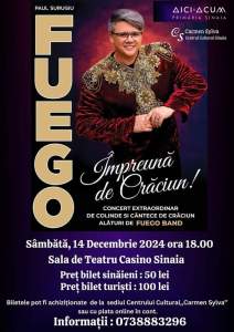 Nu rata întâlnirea cu îndrăgitul artist FUEGO, care va veni la Sinaia în cadrul turneului său național „Împreună de Crăciun”. Vino să te bucuri de un concert magic și să intrăm împreună în spiritul sărbătorilor!